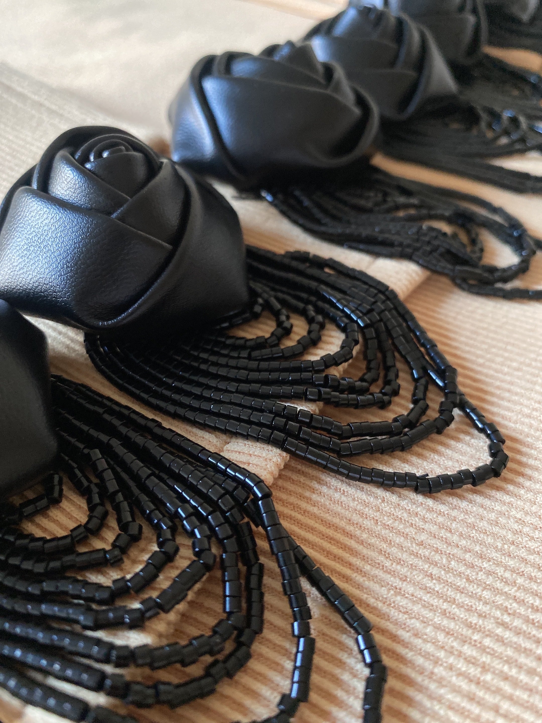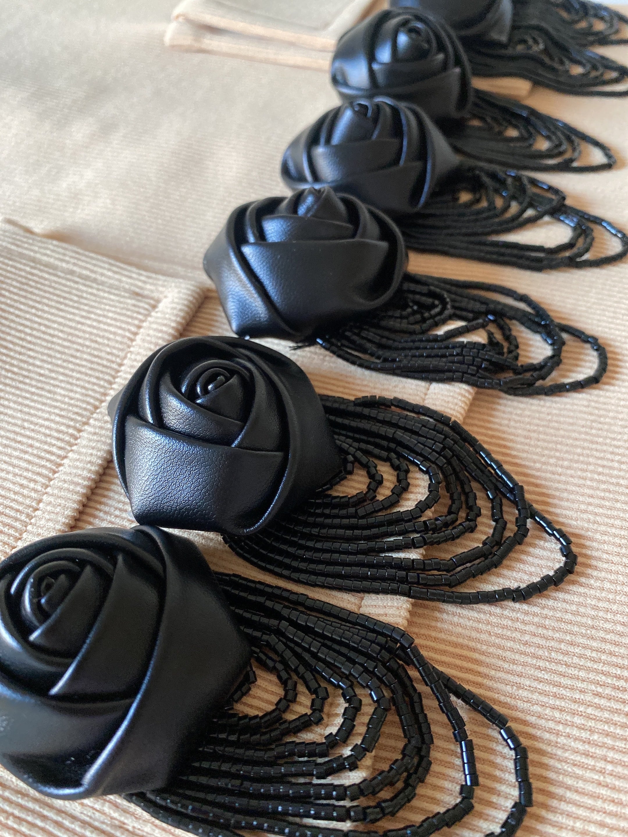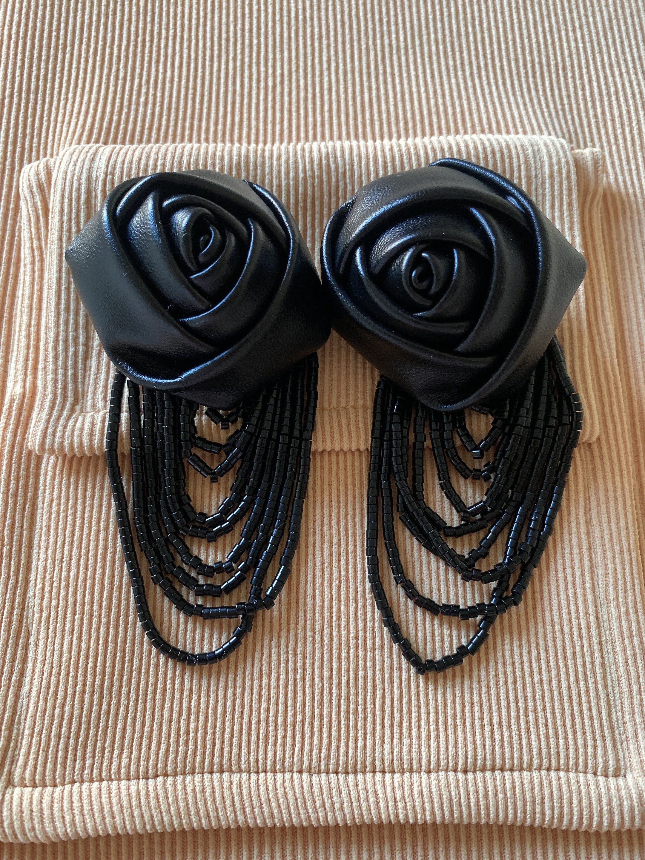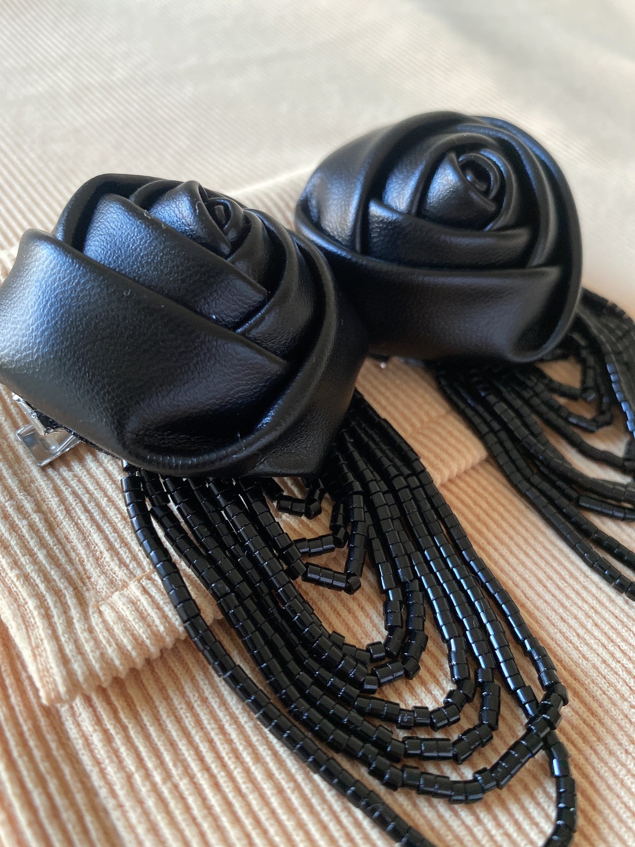 フェイクレザーのバラのモチーフとビーズタッセルのデザインとなります❤︎