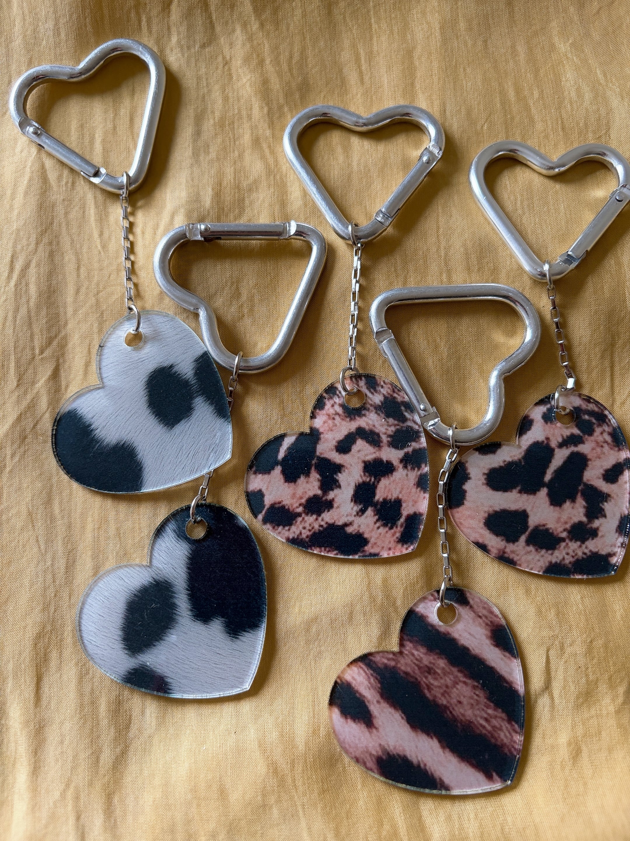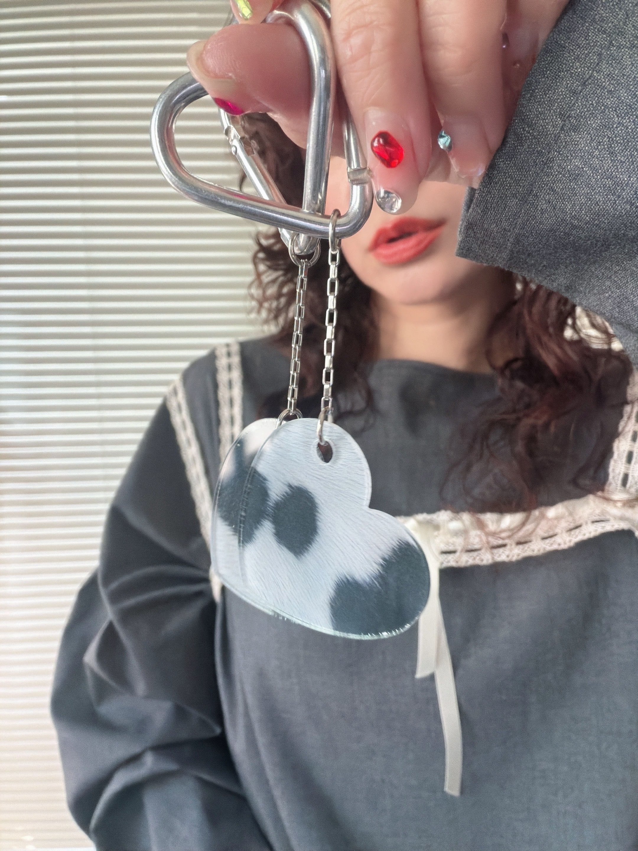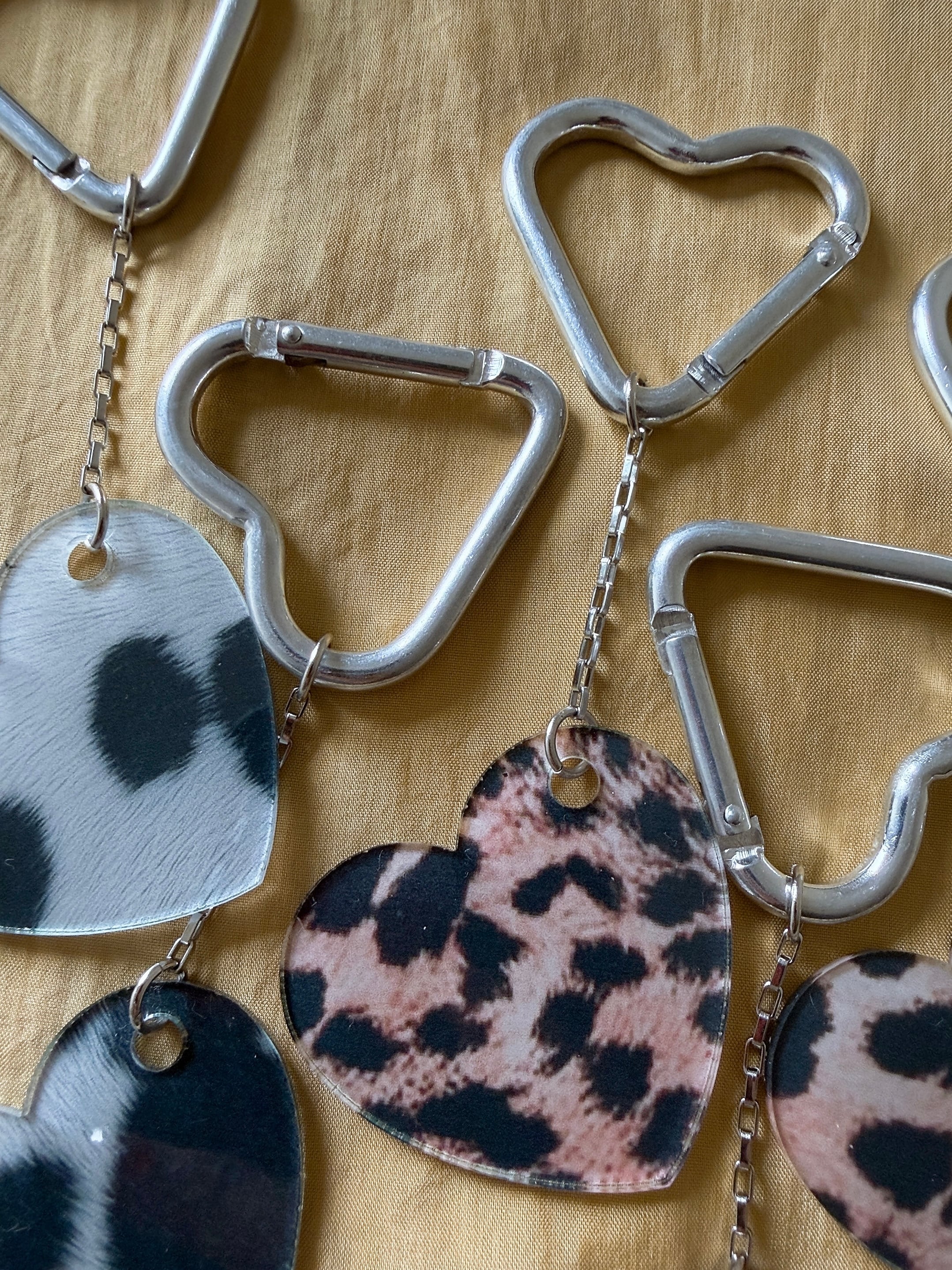 ハートのアルミ合金カラビナ、サージカルステンレスチェーン、アクリルハートチャームの組み合わせです。