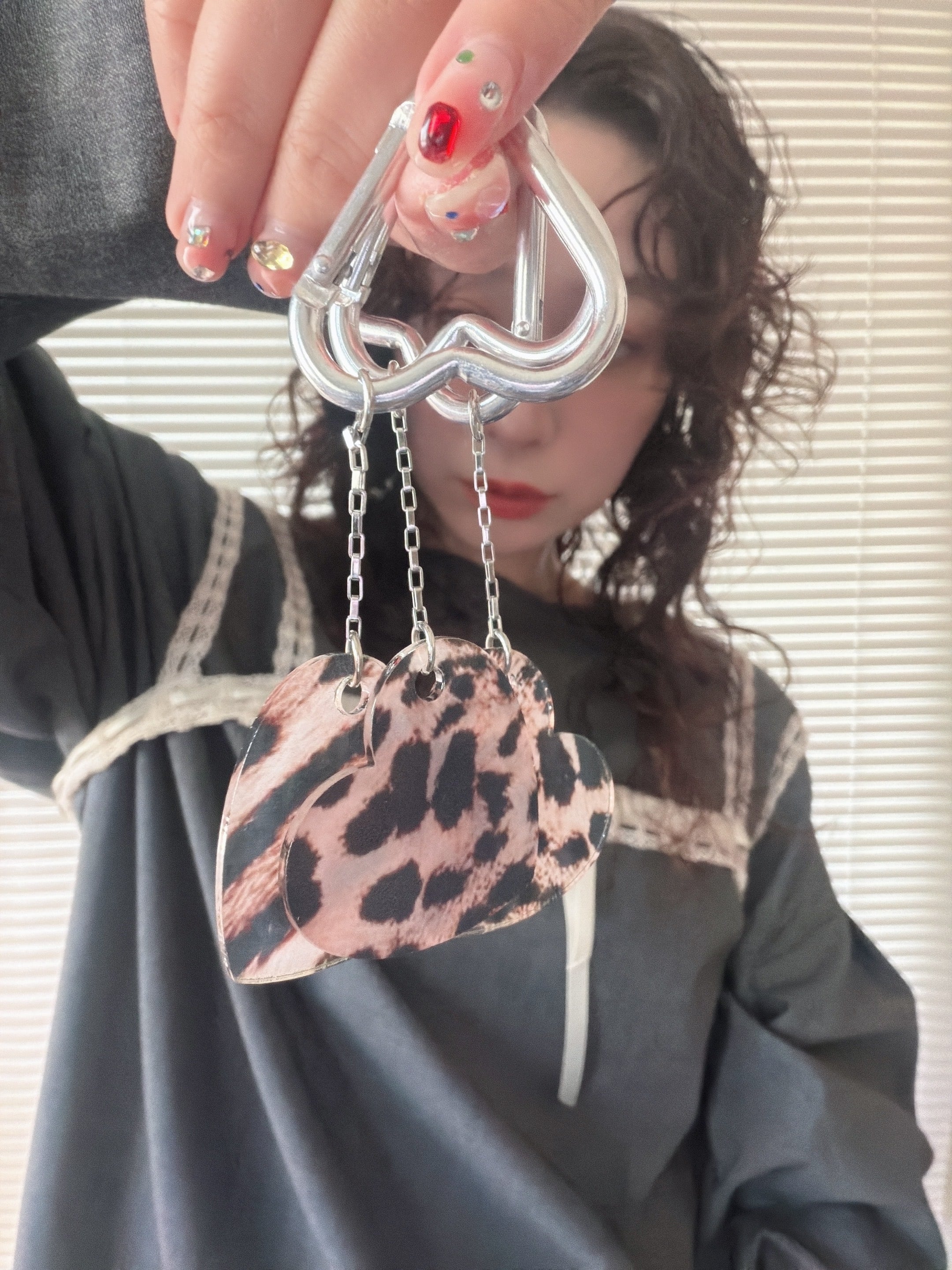 ハートのアルミ合金カラビナ、サージカルステンレスチェーン、アクリルハートチャームの組み合わせです。